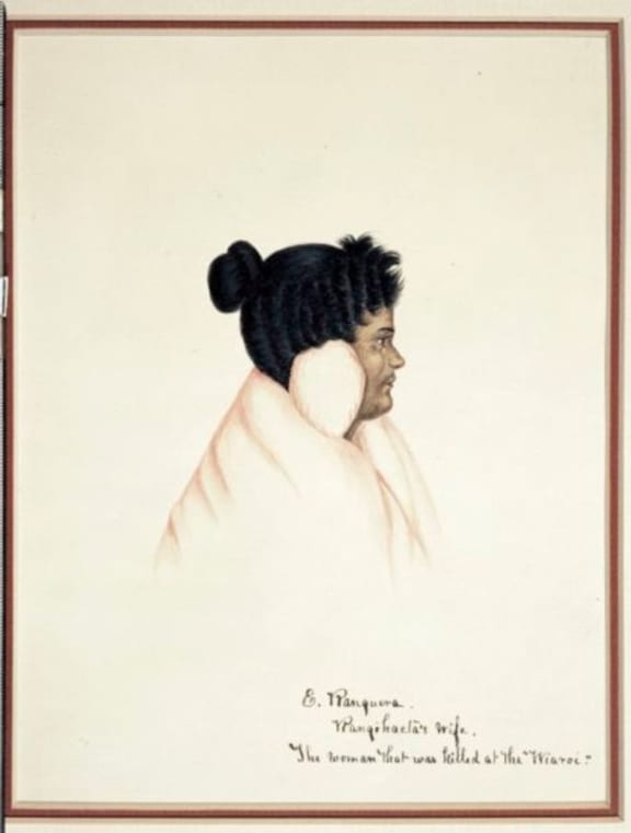 Head and shoulders profile portrait of a wife of Te Rangihaeata, named only as "E Ranguera", or Te Rangiuira, as it should be formed. Probably of Ngati Toa and/ or Ngati Raukawa descent. There is no evidence to suggest that this is the wife Te Rongo who was killed at the Wairau Affair 1843. Coates, Isaac, 1808-1878. [Coates, Isaac] 1808-1878 :E Ranguera. Rangiahaeta's wife. The woman that was killed at the "Wiaroi". [1843?]. Ref: A-286-015. Alexander Turnbull Library, Wellington, New Zealand. http://natlib.govt.nz/records/22710428