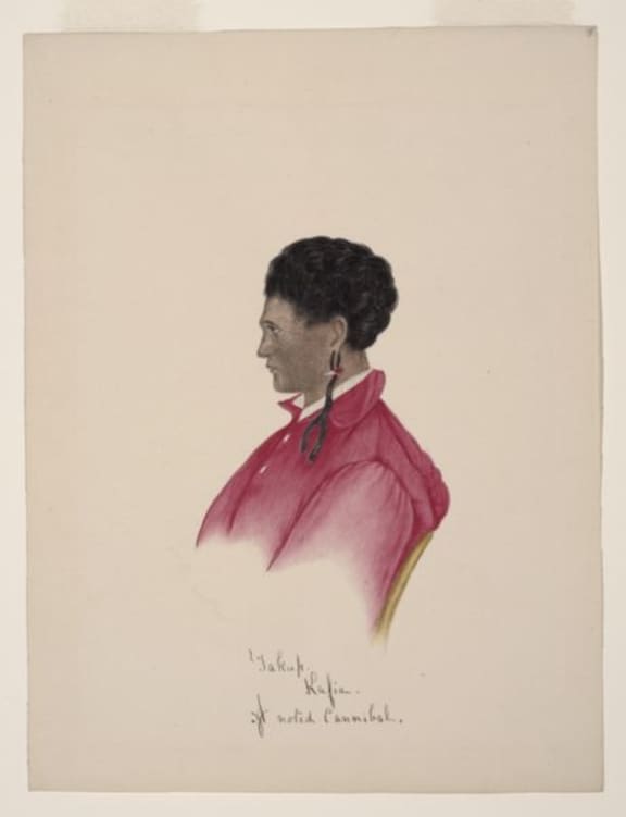Head and shoulders profile portrait of Maori chief, probably from Te Rauparaha's "Kawhia" tribe, wearing striped shirt and shark's tooth ear pendant. Coates, Isaac, 1808-1878. [Coates, Isaac] 1808-1878 :Takup. Kafia. A noted cannibal. [1843?]. Ref: A-286-011. Alexander Turnbull Library, Wellington, New Zealand. http://natlib.govt.nz/records/22681369