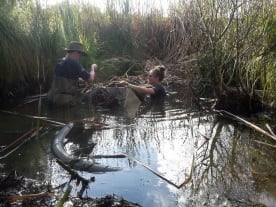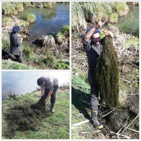 competing to see who can haul in the most water weeds using an anchor attached to a rope.