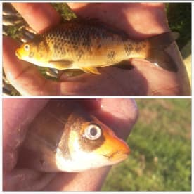 Small koi are easy to tell apart from goldfish. Koi have two soft barbells or 'whiskers' at each corner of the mouth and the lower line of the body is fairly flat compared to the arched back.