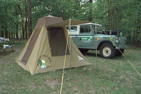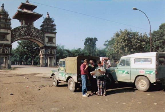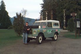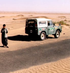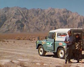 The expedition team, from left to right: Ken, Jocelyn, Gillian. Philip and both Land Rovers, of course
