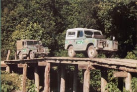 Both Land Rovers on a bridge in Nepal - a 1948 Series 1 Land Rover and a 1966 Series 2A Land Rover