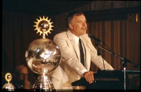 Hans Tholstrup, the “larger-than-life” adventurer, futurist and founder of the brainsport of solarcar racing, shown with the WSC trophy in 1990. Photo- Copyright: Rehia Photo Library