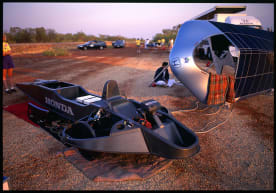 1993 Honda Dream camped after first day of racing and topping up batteries with remaining afternoon sun. Ultimate winner of the event travelling the 3000km from Darwin to Adelaide in 35 hours and 28 minutes at an average speed of 84.96 km/h. Photo- Copyright: Rehia Photo Library