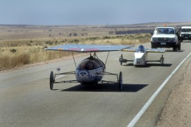 Solar Kiwi, NZ’s first solarcar, built in Hamilton by mechanic and motorsport enthusiast Stewart Lister’s small team of family and friends. The car had four electric mobility scooter motors which collectively turned the single rear wheel. (NZ Geo issue 9). Photo- Copyright: Rehia Photo Library