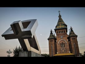 Memorial sculpture to the Timisoara Martyrs of the Romanian Revolution of 1989 outside the Catedrala Mitropolitana Timis. The Cathedral was used as a hall during the Ceaucescu era.