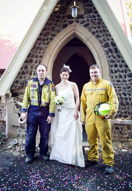 Katherine is pictured here with two firefighters who arrived in the middle of the wedding service to rope off the church.