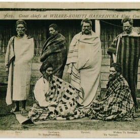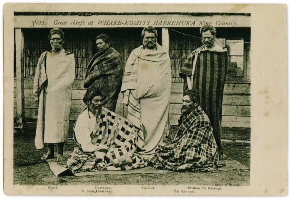 Burton was given permission to photograph six chiefs of Ngati Maniapoto, who were meeting at Whare Komiti Haerehuka in June, 1885. In the back row, from left, are Rewi Manga Maniapoto, Tawhana Tikaokao, Taonui Hikaka and Hone Wetere Te Rerenga. Te Rangituataka is seated at left and Te Naunau Hikaka at right. Maniapoto had only just returned from laying the first sod on the construction of the North Island Main Trunk Railway on April 15. His canoe was made available for railway engineer Rochfort to inspect the King Country for suitable places to build railway stations. From the collection of Leo Haks