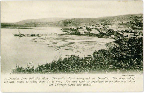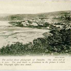 This topographic view of Dunedin was taken from Bell Hill by photographer John Tensfield in 1858 (erroneously dated 1852). It was Muir & Moodie’s first card. Similar early views of Dunedin were taken by William Meluish and are dated 1860-1872. From the collection of Leo Haks