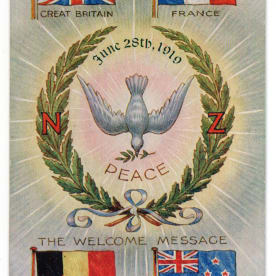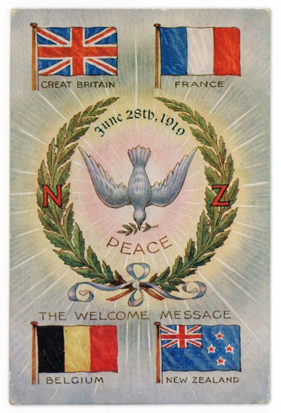 This postcard to celebrate the end of WWI was designed by J D McKenzie, a returned soldier. From the collection of Leo Haks