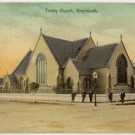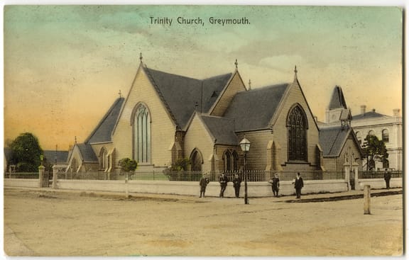 This elegant wooden Anglican church graced a street corner in the town of Greymouth in the early 1900s. From the collection of Leo Haks