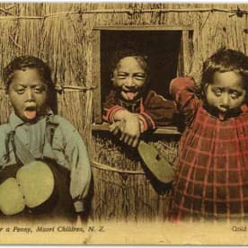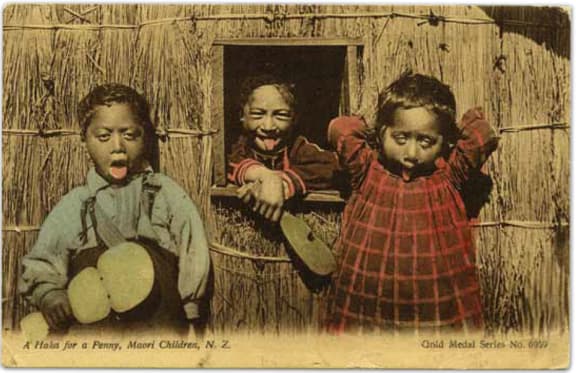 While adults demonstrated their everyday chores for tourists at Whakarewarewa Village, children became popular performers, diving into the water to retrieve pennies and performing haka for the same reward. From the collection of Leo Haks