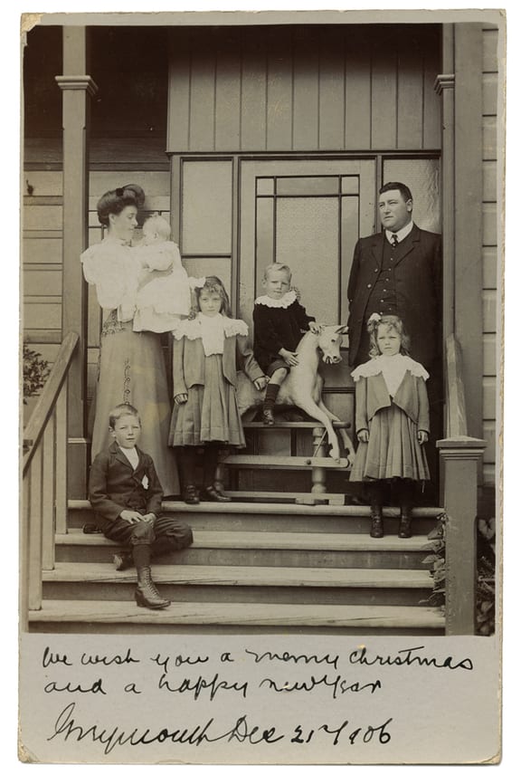 A good example of a real picture postcard, used to distribute family photographs to relatives and friends—as one might employ email or social media today. The handwritten message reads: “We wish you a Merry Christmas and a Happy New Year; Greymouth, Dec 21, 1906.” From the collection of Leo Haks
