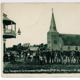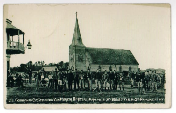 Men of the Opotiki Expedition, Patea Rangers and Wanganui Yeamanry Cavalry are pictured in front of the Church of St Stephen the Martyn in Opotiki, 1868.