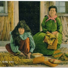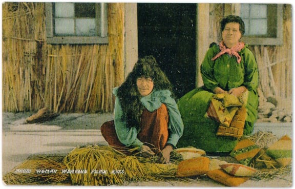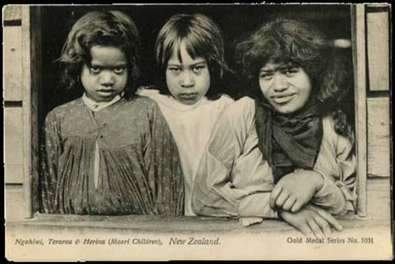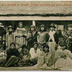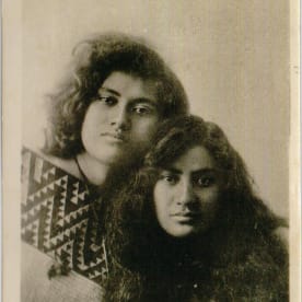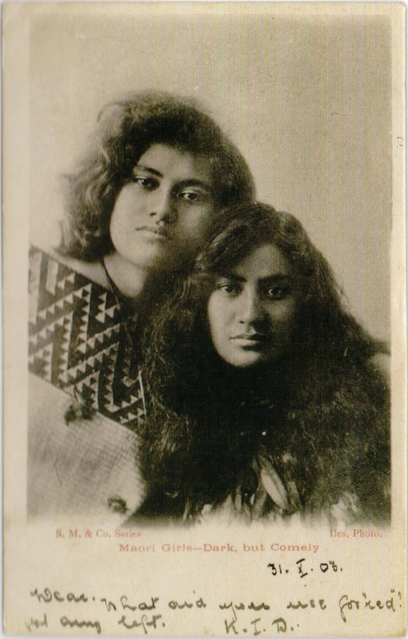 This SM & Co series postcard features a photograph by Arthur Iles, together with an attitude in the caption that reflected wider stereotypes: ‘Maori girls, dark but comely’. 1903. From the collection of Leo Haks