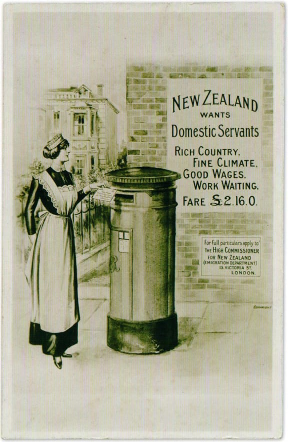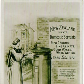 New Zealand needed people and finance to build its infrastructure. In 1913, on behalf of the government, the New Zealand High Commissioner’s office in London advertised for migrants from Britain, France and elsewhere to relocate to New Zealand and contribute to its development. This card was not only a request for domestic servants; its aim was to secure women to become wives as well as workers in order to correct the imbalance of the sexes in colonial New Zealand. Other postcards in this series aimed to attract potential farmers or industrialists by targeting skills and capital. Cultural activities were also promoted, but most of the images advertised a lifestyle that was far superior to the reality for most migrants. From the collection of Leo Haks