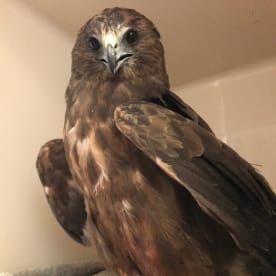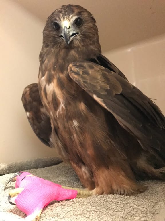 This harrier hawk, or kahu, was being treated for lead poisoning. The bandages protect the harrier's feet from being pierced by its own talons, a neurological reaction to the lead in its bloodstream. Photo: Dr. Lisa Argilla.