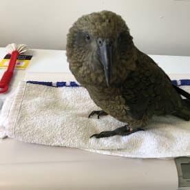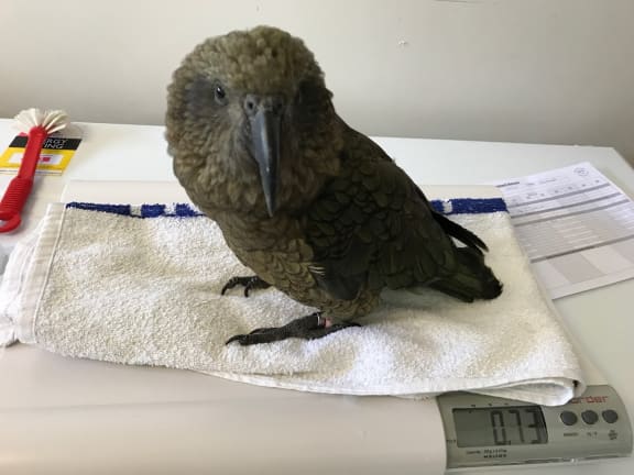 A kea is weighed in at the Wildlife Hospital Dunedin. Two kea have been treated since the Hospital opened in January 2018, one with lead poisoning and one with a concussion. Photo: Dr. Lisa Argilla