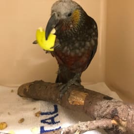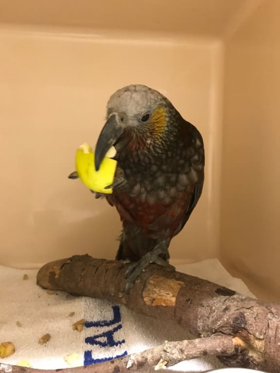 A kaka perches on a piece of native wood while snacking. The kaka in Hospital this year have been our most mischievous patients. Photo: Dr. Lisa Argilla.