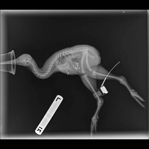 An x-ray of a Haast kiwi. Note the location transmitter attached to its leg. Photo: Wildlife Hospital Dunedin.