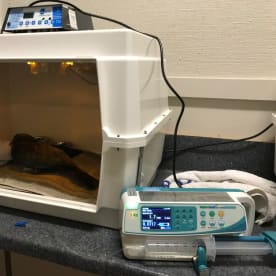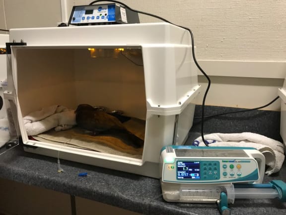 A kereru receives treatment in one of the Wildlife Hospital Dunedin's ICU incubators, as well as medication from a syringe driver. Both pieces of equipment were donated by individuals who support our work: a vet who ran the Christchurch marathon to raise money for us, and a woman who used the donation as a memorial to her late mother. Photo: Dr. Lisa Argilla.