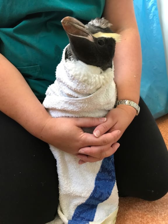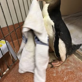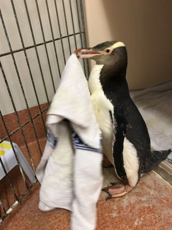 A yellow-eyed penguin patient indicates it is time to clean its cage and provide fresh towels. Photo: Dr. Lisa Argilla