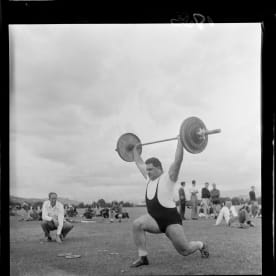 An unidentified weightlifter competing at the Petone Recreation Grounds, Wellington, in 1956. Alexander Turnbull Library, Wellington, EP ⁄ 1956 ⁄ 2876-F