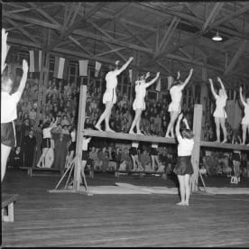 A gymnastics display held at the opening of a new YMCA, probably in Palmerston North. The YMCA and YWCA were important patrons of sport in New Zealand. Manawatū Heritage, Palmerston North, 2014N_ELMAR_008406