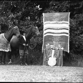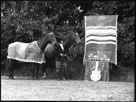 Agricultural and pastoral associations played an important role in promoting sport, as providers of both facilities and sporting events, notably show days. Here Miss White poses with trophies won at shows in Wairarapa, Manawatū and Taranaki. Manawatū Heritage, Palmerston North, 2011G_ELMAR-3_005456