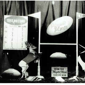 Arguably, the 1956 Springbok tour represented the high-water mark of rugby nationalism in New Zealand. The All Blacks prevailed 3–1 in an intensely contested series. Businesses were well aware of public interest in the tour, as seen in this window display at G. Mitchinson, Tobacconist, in Featherston Street, Wellington. W. D. & H. O. Wills (NZ) Ltd, courtesy of New Zealand Rugby Museum, Palmerston North, F1086a