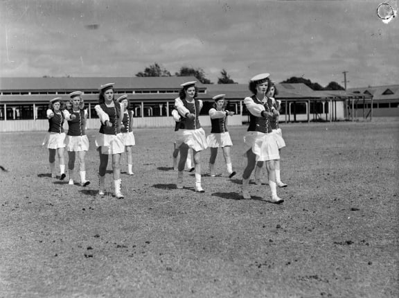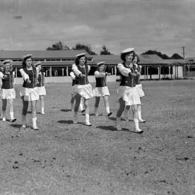 A marching team practising in the 1940s, probably in Palmerston North. Introduced in the interwar period, marching peaked in popularity during the 1970s and 1980s. Manawatū Heritage, Palmerston North, 2013G_ELMAR-B5_006957
