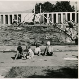 Swimming pools were readily available in New Zealand compared to many other places in the world. Pictured here c. 1950 are the Hokowhitu School Swimming Baths in Palmerston North, which were built by unemployed workers on a relief scheme during the depression. Manawatū Heritage, Palmerston North, 2014P_Sc88b_007714