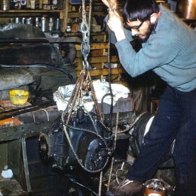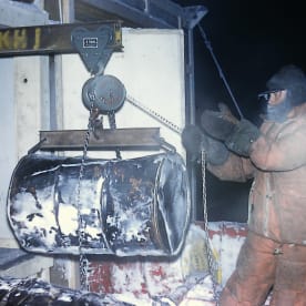 A drum hoisted and about to roll into the thawing tunnel using the overhead gantry. (Bob Buckley, 1960)