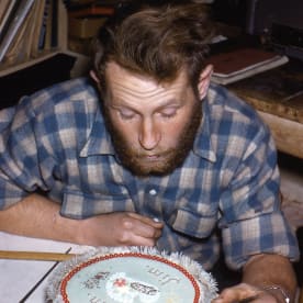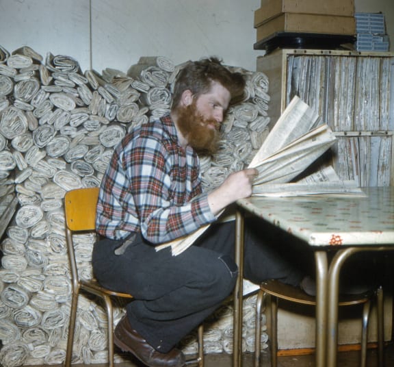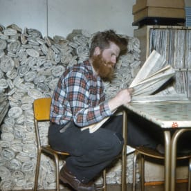 Colin Jenness catching up on the news, sitting in front of a pile of newspapers. The rest of the papers from the first flight were stacked against the opposite wall. (Colin Bailey, 1960)
