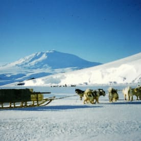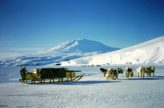 A dog team and sledge on the sea-ice with Mount Erebus in the background. (Bob Buckley, 1960