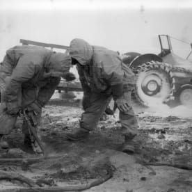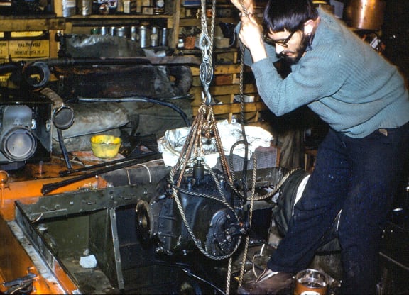 We often got a closer view when replacing a track. This was relatively easy once the Weasel had been jacked up, but it did require a bit of brute force. This Weasel has had the flotation tanks removed and the heater mounted at the front.