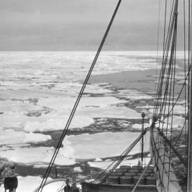 From the flying bridge, looking over the avgas drums to the pack and the twisting channel showing how the Endeavour kept turning to follow the easiest path through the ice.