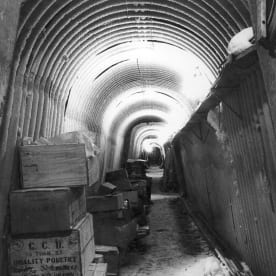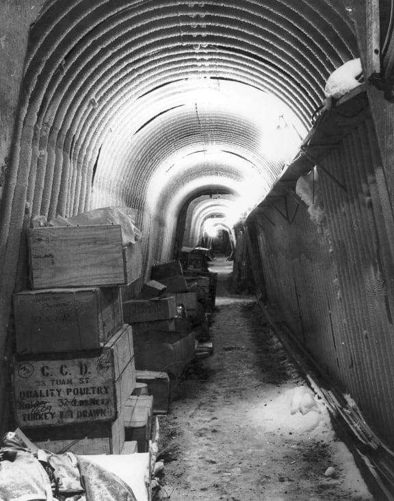 The covered-way looking towards the mess hall with power cable duct right-hand side and food boxes on the left. This winter photograph shows a thick layer of frost lining the corrugated-iron tunnel.