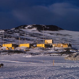 The original Scott Base looking north across the sea ice in 1960.