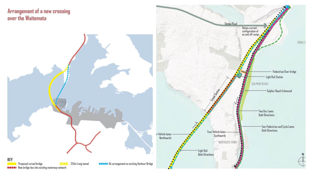 He's throwing a new option into the mix: a new bridge that curves out on the western side of the existing Harbour Bridge that would be for north-bound traffic, while south-bound traffic would use the original bridge, with two lanes left for exclusive use by cyclists and pedestrians.