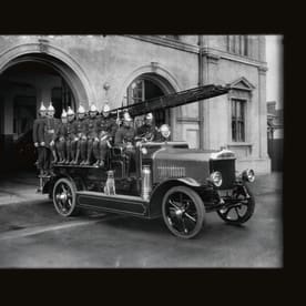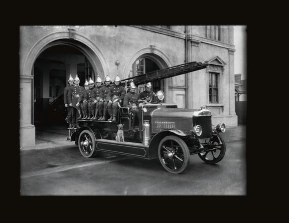 Firemen and fire engine, Whanganui (1926), Tesla Studios. (Alexander Turnbull Library)