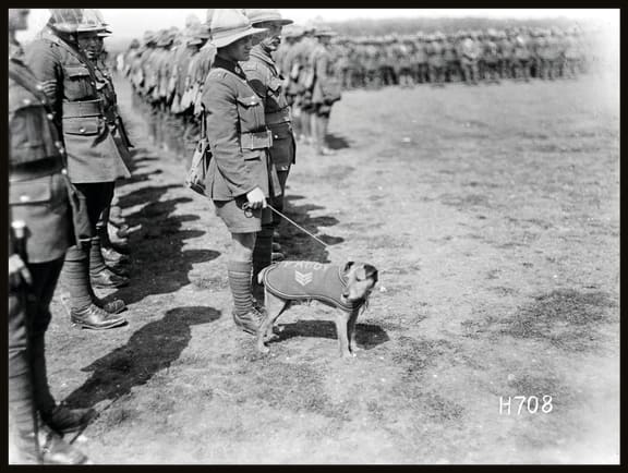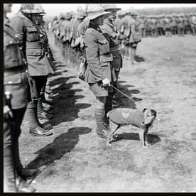 Paddy, the canine mascot of the Wellington Regiment, at a troop inspection in France (30 June 1918), unknown photographer. (Alexander Turnbull Library)