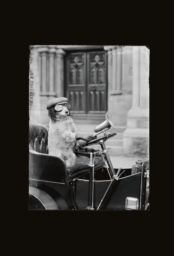 Dog at the wheel of a car (1920s), unknown photographer. (Alexander Turnbull Library)