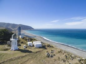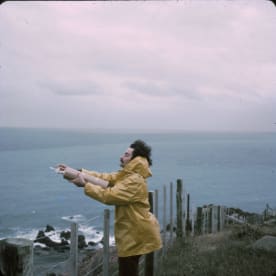 Dave Lowe taking an air flask sample at the edge of the Baring Head cliff in 1972.