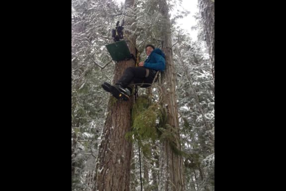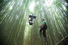 Bryan Smith and camera platform suspended from trees. Photo: Reel Water Productions