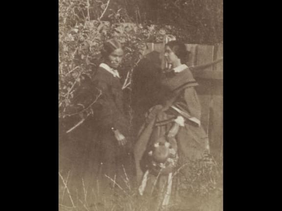 Jessie Cruickshank Crawford (1828–1880), in the late stages of pregnancy. The Māori woman on the left is identified as ‘edgar (nurse)’; she may have been a monthly nurse. Photographed by James Coutts Crawford in the late 1850s or early 1860s. Detail from PA1-q-264-18-3, Webster Collection, Alexander Turnbull Library