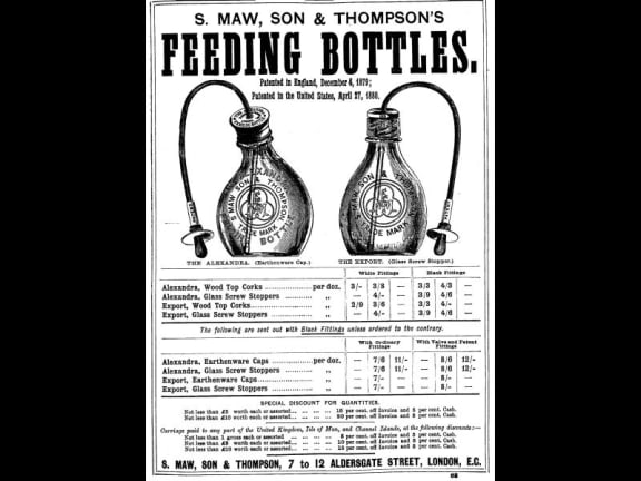 Popular feeding bottles, advertised in an 1889 trade journal. Parents and caregivers often used tubing that was much longer than that shown in these illustrations. Chemist and Druggist, 2 November 1889, W.A. Baylis the Chemist Limited records, 84-126, Hocken Collections, Uare Taoka o Hākena, University of Otago