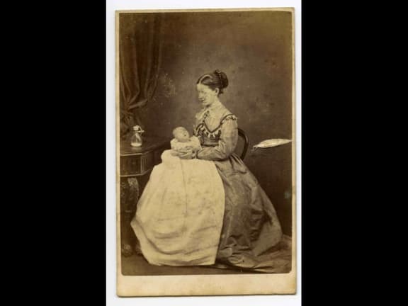 An unidentified woman and baby, photographed in Dunedin by J. McGregor and Company between the late 1860s and early 1880s, with a typical feeding bottle of the era. Album 66. © Toitū Otago Settlers Museum