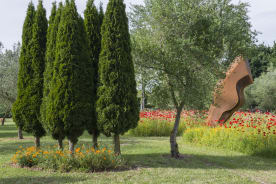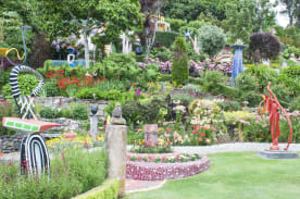 Looking up to the Bon Bon Palace from the lawn by the house across the rich tapestry of art and garden. Josie's world is inventive and intense and supremely cheerful.