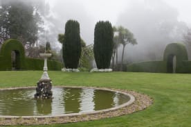 Standing out against this misty backdrop a pair of Irish yews is reflected in the pond.